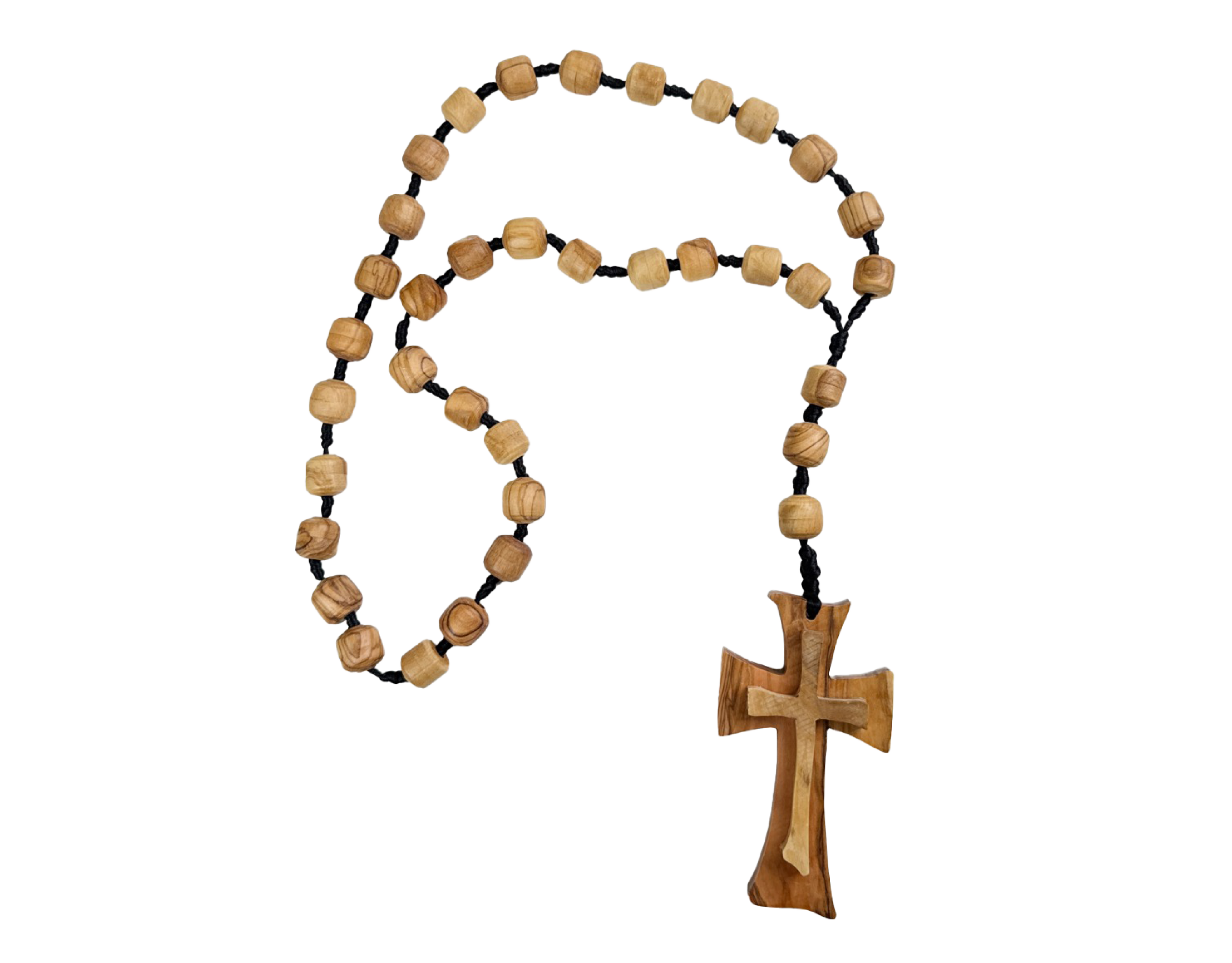 مسبحة حائط دينية مصنوعة يدويًا من خشب الزيتون الطبيعي، تتكوّن من 33 خرزة مصقولة بعناية، ومجمّعة بخيط متين ينتهي بـ صليب من خشب الزيتون يحمل عروق الخشب الأصلية وتدرجاته الدافئة.